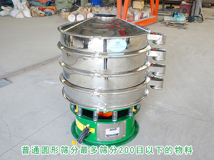 普通圓形篩分設備可篩分粉末、顆粒裝物料,也可以過濾500目以下液體、漿液狀物料;