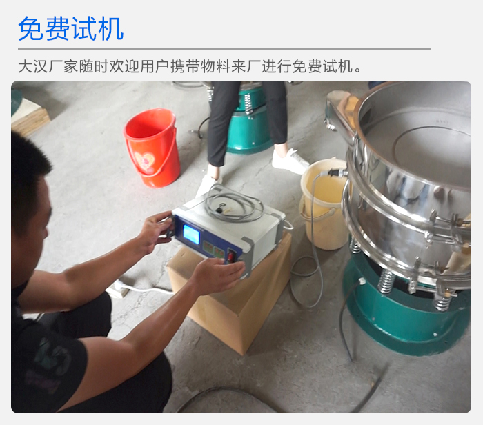 如果您想了解超聲波振動(dòng)篩的工作狀況,大漢廠家隨時(shí)歡迎用戶(hù)攜帶物料來(lái)廠進(jìn)行免費(fèi)試機(jī)。