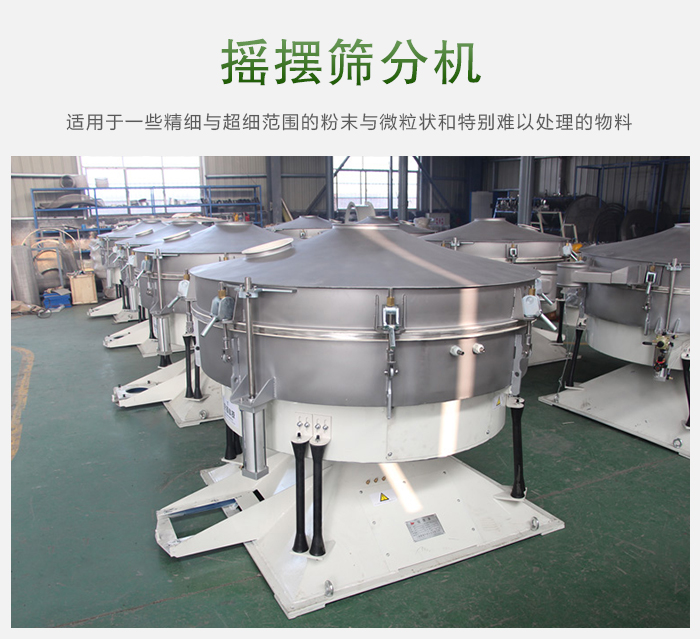 搖擺篩分機是由普通電機傳動作基本的回轉運動與人工篩分相類似,使物料在篩網上形成水平與拋擲三維翻滾運動,從中心到外緣在整個篩面上均勻分散,從而以螺旋運動往軸向傳播。調整擺振體上面的經向角和切向角可改變物料在網面上的運動軌跡。