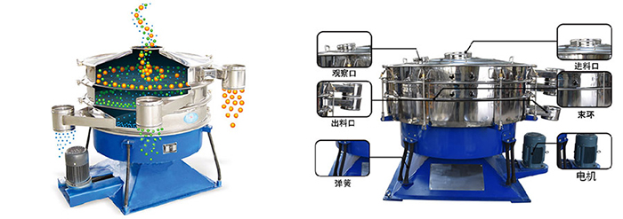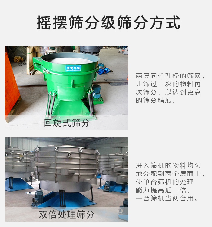 1、回旋式篩分:兩層同樣孔徑的篩網,讓篩過一次的物料再次篩分,以達到更高的篩分精度。