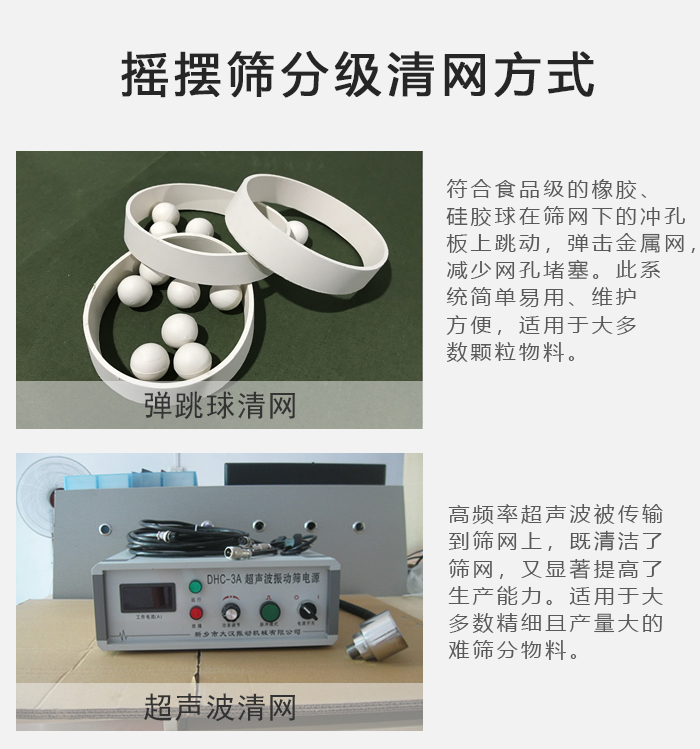 超聲波清潔:高頻率超聲波被傳輸到篩網上,既清潔了篩網,又顯著提高了生產能力。適用于大多精細的、大產量的、難篩分的物料。