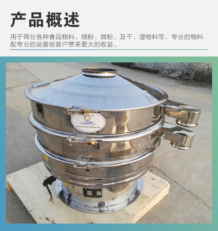 主要用于篩分各種食品物料,細(xì)粉、微粉、及干、濕物料等;很自然達(dá)到客戶要求,本產(chǎn)品精致實(shí)用,專業(yè)的物料配專業(yè)的設(shè)備會(huì)給客戶帶來(lái)更大的收益。