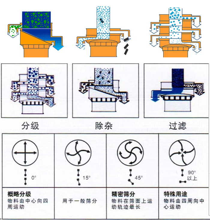 不銹鋼振動(dòng)篩采用YZUL立式振動(dòng)電機(jī)作為激振源,通過(guò)振動(dòng)電機(jī)上下兩端的偏心重錘將旋轉(zhuǎn)運(yùn)動(dòng)轉(zhuǎn)變?yōu)樗健⒋怪薄A斜的三次元運(yùn)動(dòng),并傳遞到旋振篩的篩面上;物料通過(guò)入料口進(jìn)入設(shè)備內(nèi),根據(jù)不同物料篩分要求,物料經(jīng)過(guò)1-5層采用不同目數(shù)的金屬編織篩網(wǎng)的篩分層,在這個(gè)過(guò)程中,位于各層的篩網(wǎng)下的清網(wǎng)裝置(彈跳球)通過(guò)頻率振動(dòng)不斷撞擊不銹鋼篩網(wǎng),使篩網(wǎng)上層物料能夠順暢的透網(wǎng)篩分,并有效解決了物料堵網(wǎng)問(wèn)題出現(xiàn),不同目數(shù)的物料通過(guò)各層對(duì)應(yīng)目數(shù)的篩網(wǎng)后在各層的出料口排出,最終實(shí)現(xiàn)篩選除雜或過(guò)濾分級(jí)的目的。